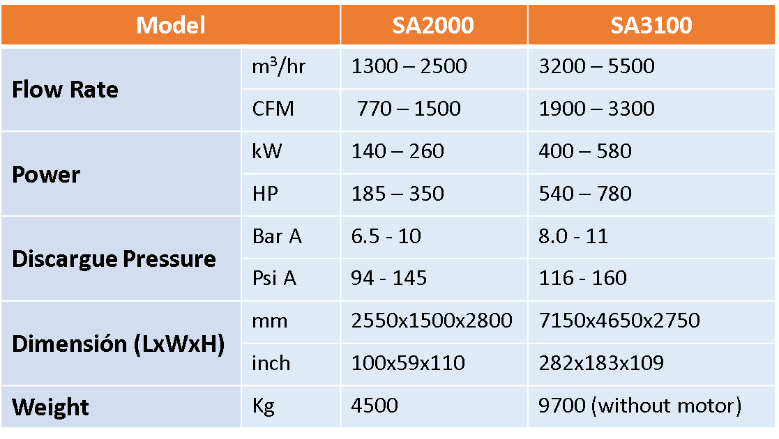Compresor turbo de aire enfriado por aire. No necesita suministro de agua para refrigeración ahorrando consumo de agua, tratamiento de agua e instalación de torres de enfriamiento. La serie SA proporciona un mejor rendimiento para clientes en diversas industrias, especialmente en áreas con escasez de agua o agua de mala calidad, frialdad severa y región de alta montaña.
